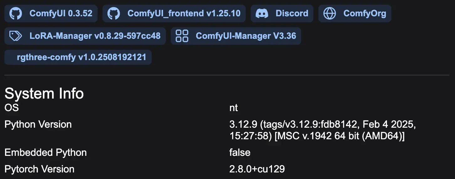 Open Creative Studio is confirmed to work with the following versions of Python, Pytorch, and ComfyUI components: